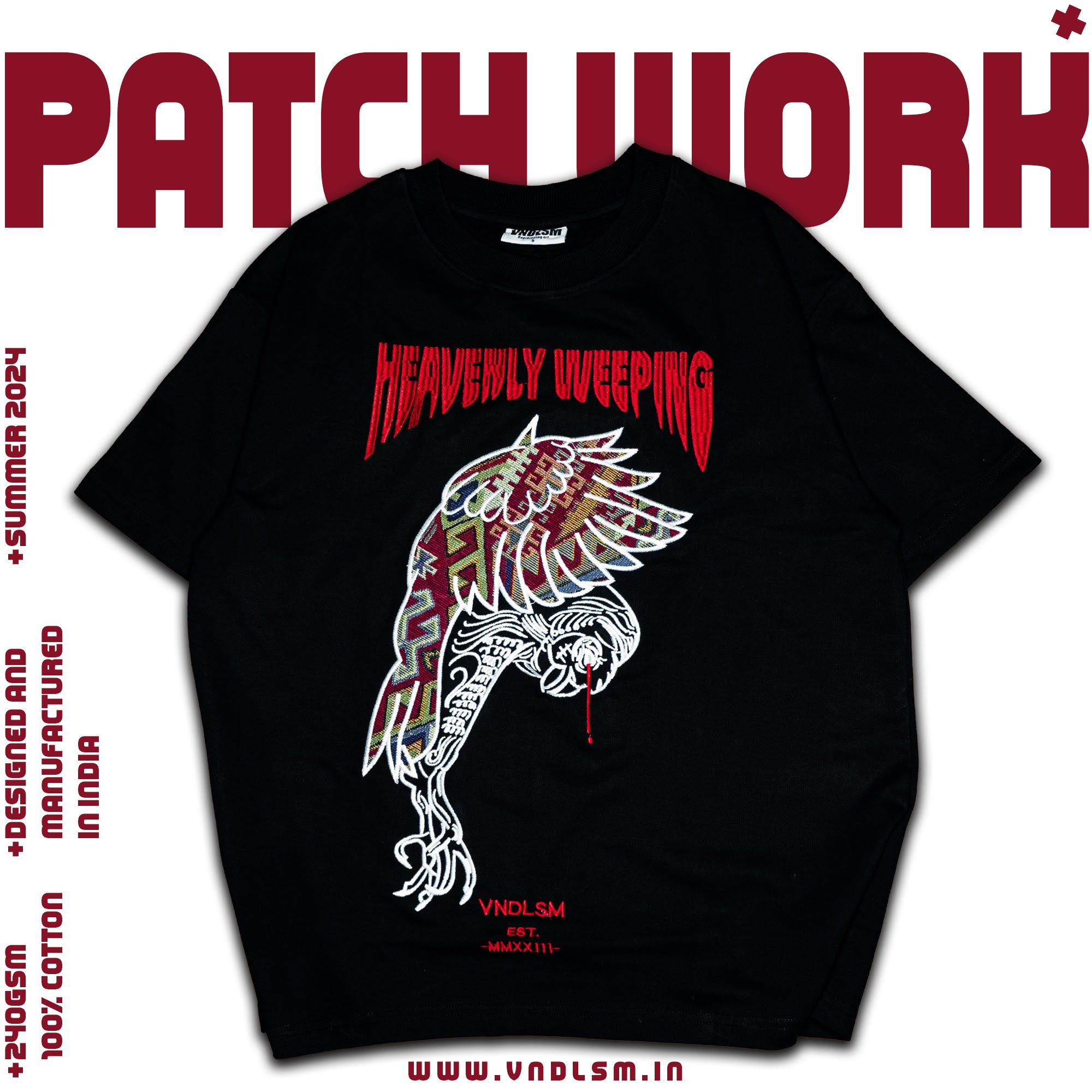 • Front – patchwork and embroidered typography